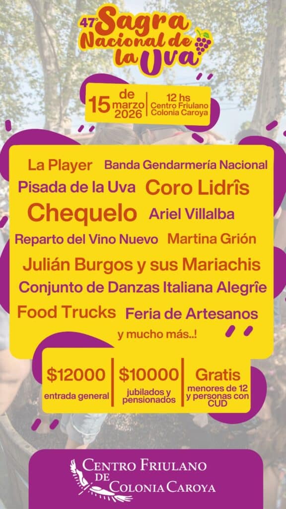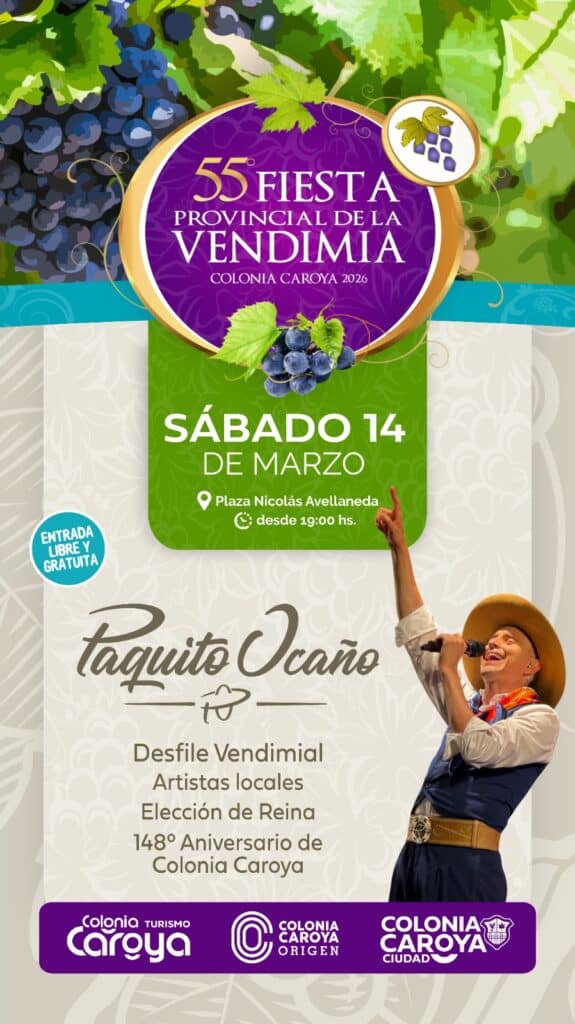 La Sagra Nacional de la Uva celebrará su 47º edición en Colonia Caroya El próximo domingo 15, Colonia Caroya será escenario de una de sus celebraciones más tradicionales con la realización de la 47º Sagra Nacional de la Uva, una fiesta que rinde homenaje a la producción vitivinícola y a las raíces culturales de la […]